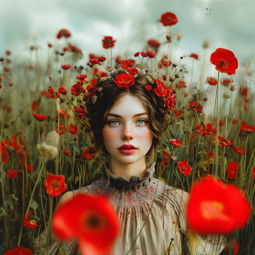 Art and AI converge in this image: a young woman amidst a sea of digital poppies, where every petal and expression is a testament to the fusion of organic beauty and computational precision.